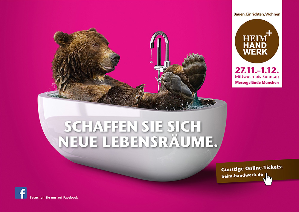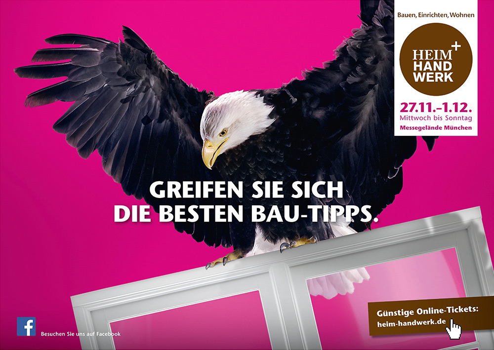Die Idee der Münchner Kreativen: drei Raubtiere und ihre Fähigkeiten direkt mit den drei Hauptthemen der Heim+Handwerk zu verbinden und diese plakativ zu kommunizieren. So steht der Löwe für das Erbeuten neuer Wohnideen, der Bär für das Schaffen neuer Lebensräume und der Adler dafür, sich die besten Bau-Tipps zu greifen. Auch das Layout wurde aufgeräumt: Die Eckdaten der Messe wurden mit dem Logo auf einer kompakten Informationsfläche zusammengefasst.