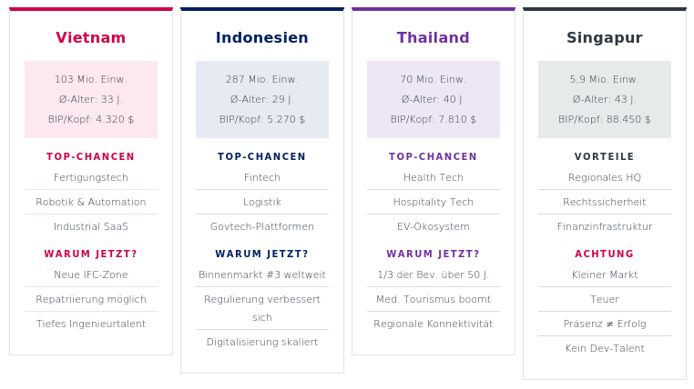 Singapur nimmt eine Sonderrolle ein: Es ist kein echter Markt für die meisten Unternehmen – dafür ist es zu klein und zu teuer. Es ist ein Eintrittsportal. In 90 Minuten und für 3.000 SGD ist eine Private Limited Company gegründet. Investoren vertrauen dem Rechts- und Bankensystem. Von dort aus erschließt man die Region. „Wer in Singapur präsent ist, hat noch nichts gewonnen – aber wer ohne Singapur regional operieren will, macht es sich unnötig schwer."