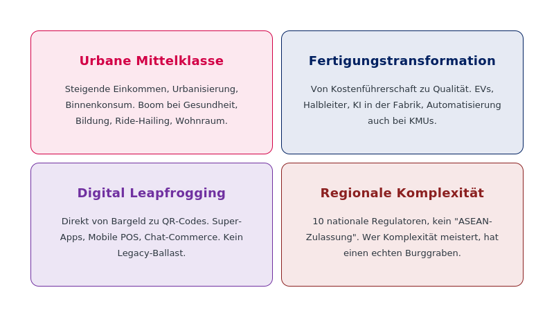 Was die Zahlen nicht zeigen: ASEAN ist kein einheitlicher Markt. Meyers machte das an einem einfachen Beispiel deutlich. Als Grab – die Southeast-Asian-Superapp – in Indonesien startete, musste das Unternehmen seine gesamte App, den Kundenservice und das Marketing von einem Teil Javas auf den anderen anpassen. Nicht von Land zu Land – innerhalb derselben Insel, 600 Kilometer voneinander entfernt.